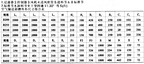 空氣輸送斜槽主要組成零部件有:進料溜管、直槽體、槽架、窺視窗、出料溜管。